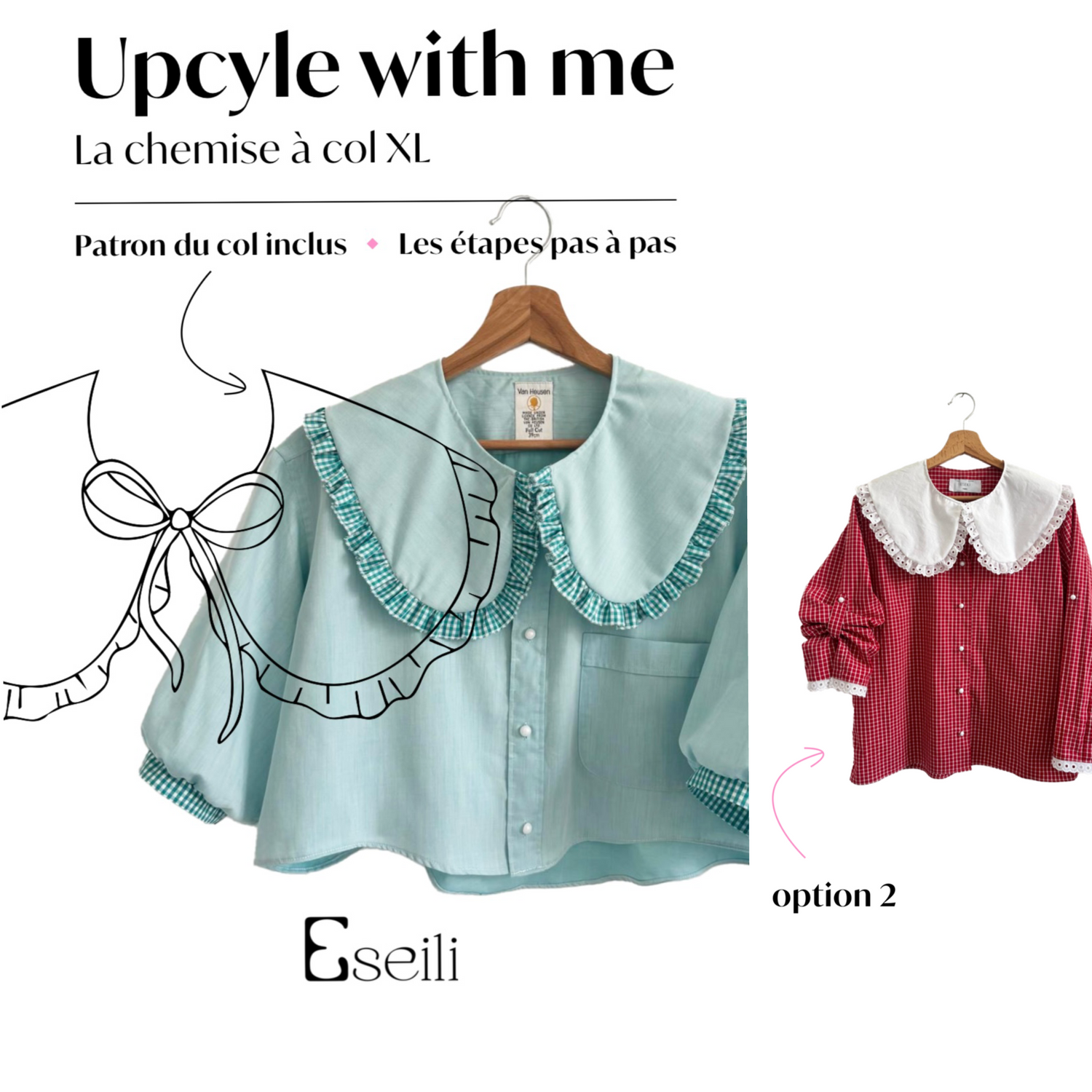 Le patron du col et les explications illustrées pour upcycler les chemises en blouse à col XL "Solange" (plusieurs variantes).