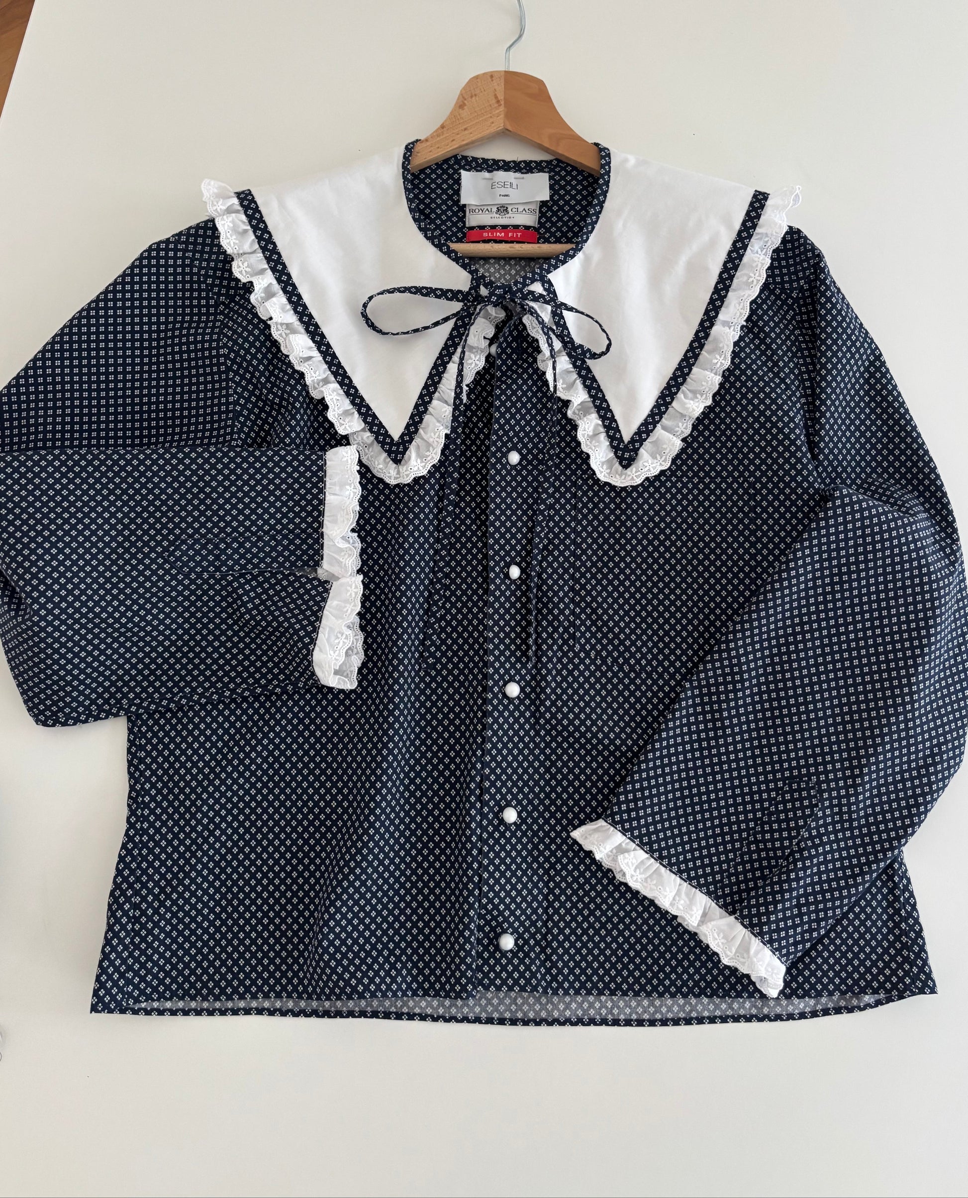 Chemise upcyclée à partir d'une chemise d'homme de seconde main bleu nuit à motifs blancs et d'un tissu en coton blanc. Finitions broderie, boutons blancs irisés, lien à nouer.