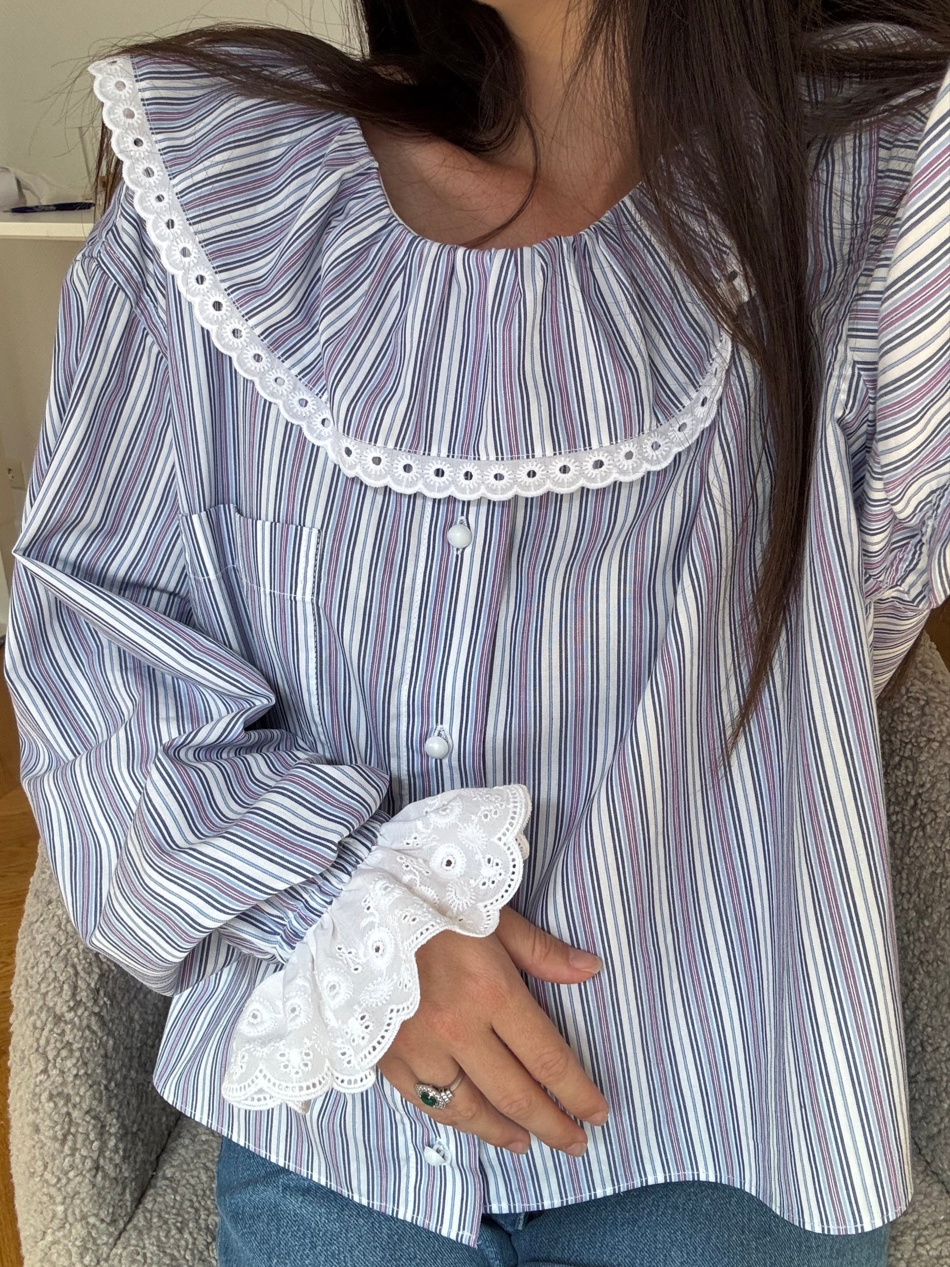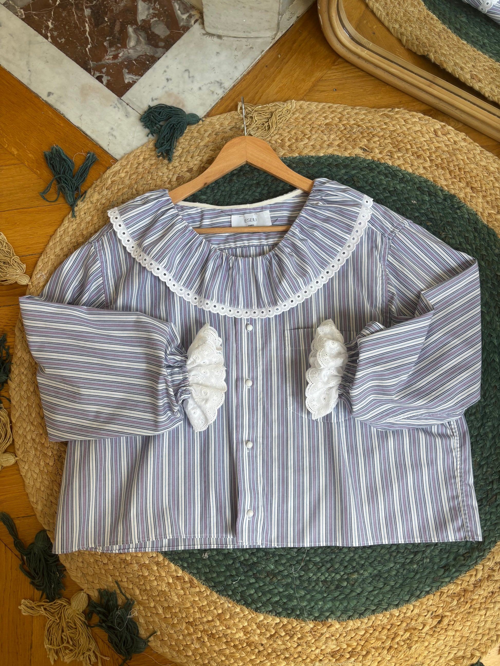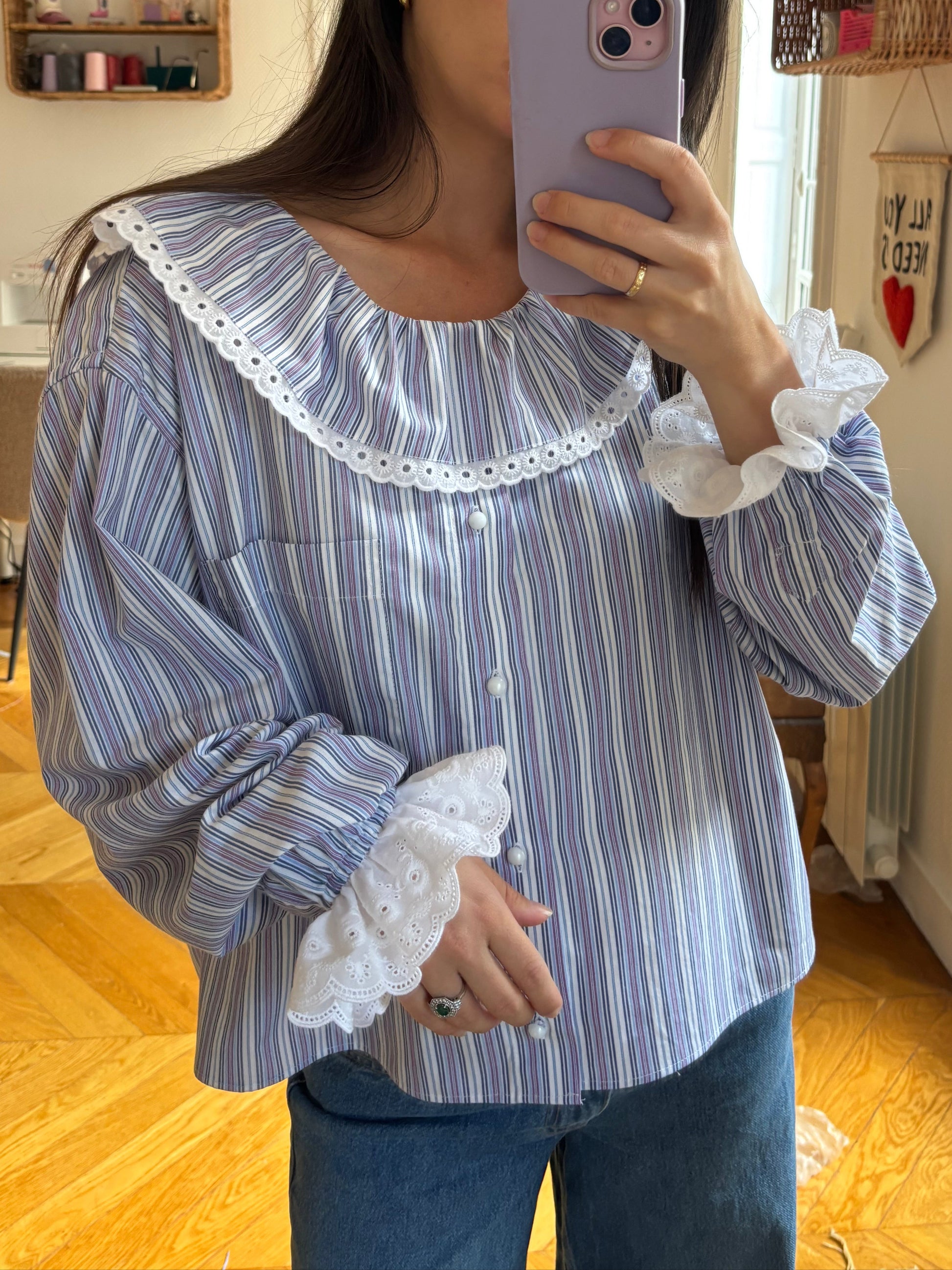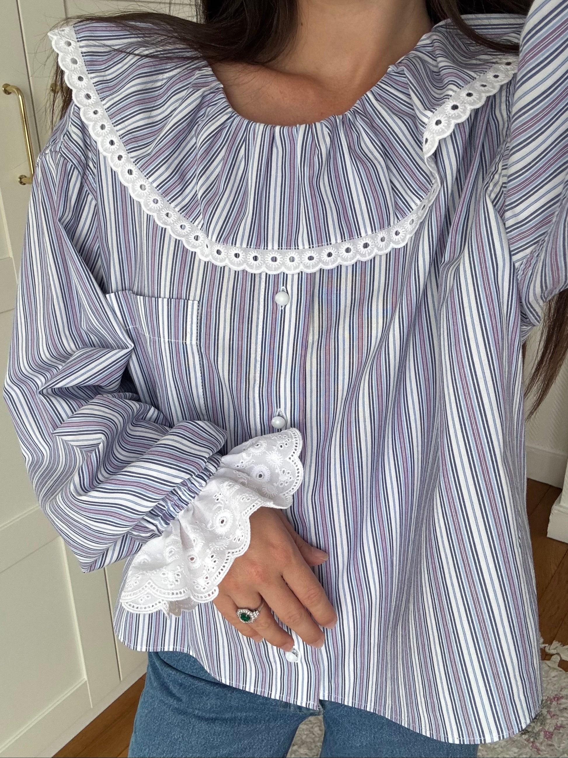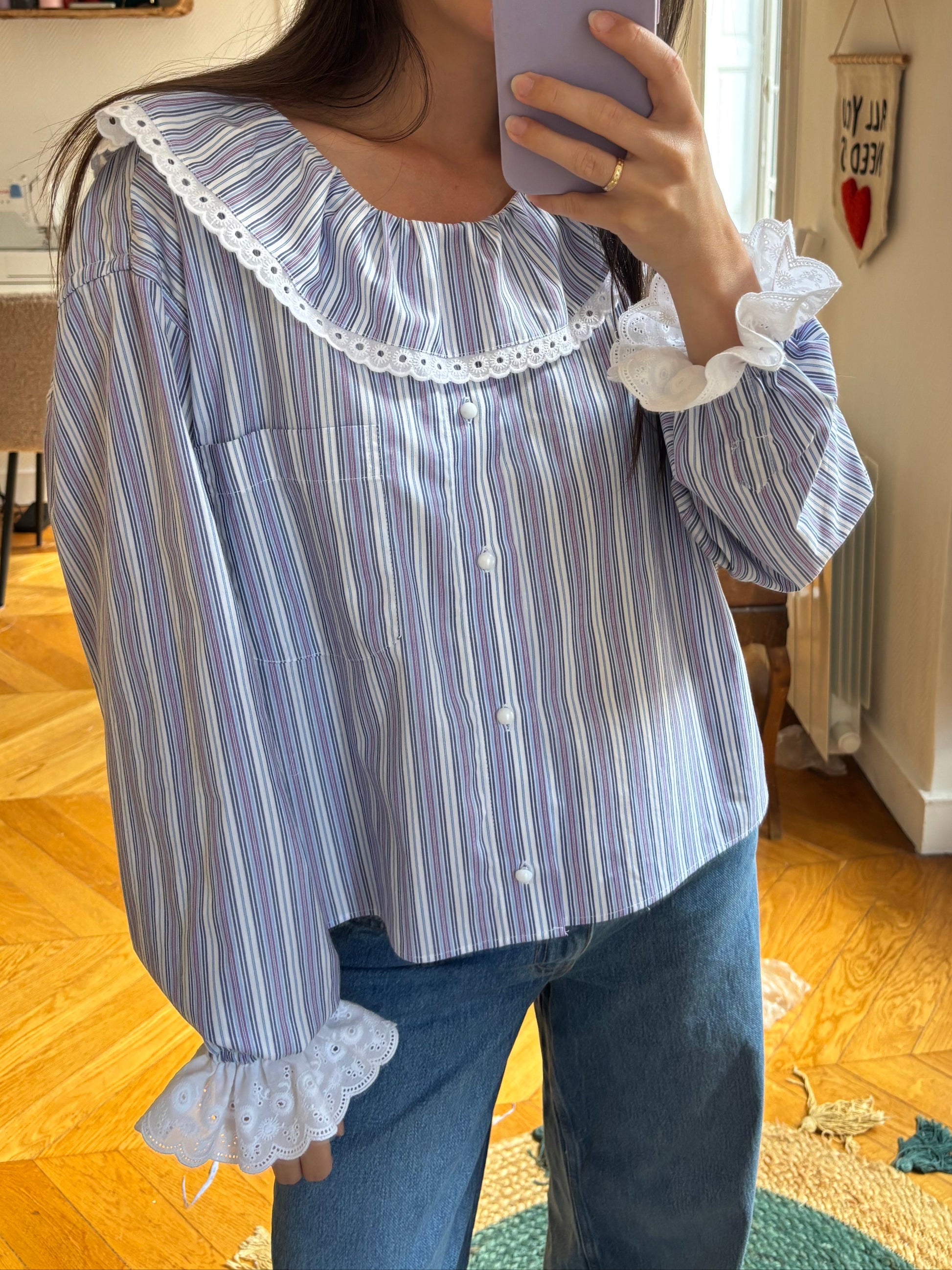 Chemise upcyclée à partir d'une chemise d'homme de seconde main à rayures (blanches, lilas...) en blouse à volant, broderie anglaise , boutons blancs irisés, poignet élastiqué avec broderie.